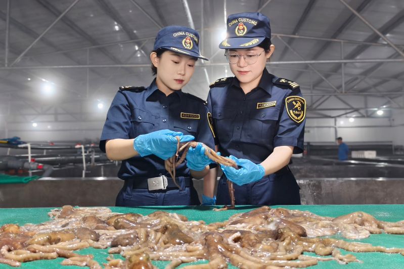 “這批活章魚要趕中午的船期,”王國利邊說邊拿出單兵設備逐項核對信息,“我們要在確保監(jiān)管質量的前提下,全力與時間賽跑?!?