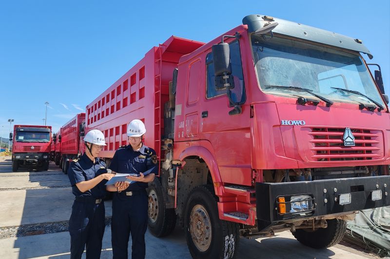 圖為:海關(guān)關(guān)員對出口工程車進(jìn)行現(xiàn)場查驗(yàn) 韓云婷/攝