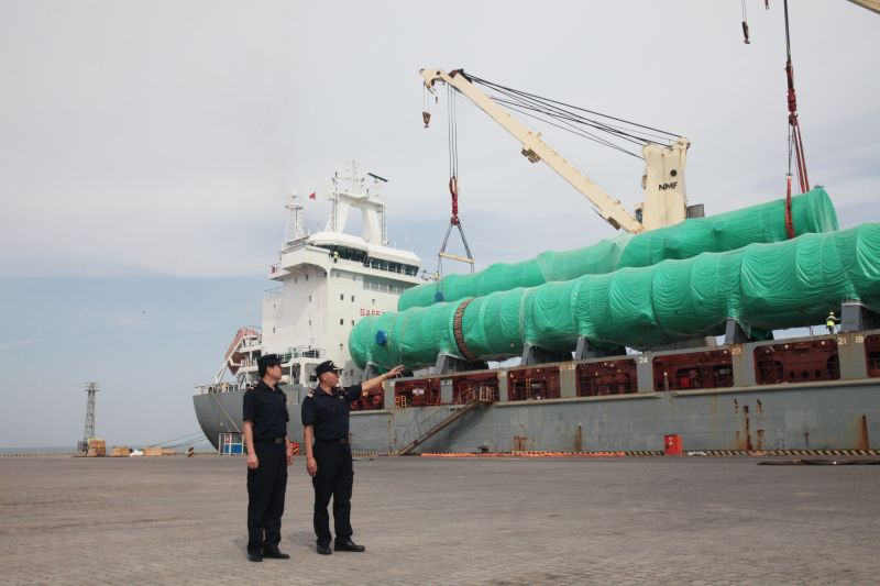 圖為:海關(guān)關(guān)員監(jiān)管塔器設(shè)備出口  孫偉航/攝